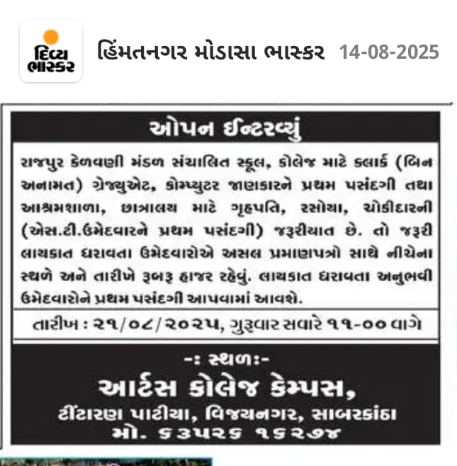 આર્ટસ કૉલેજ ભરતી દ્વારાક્લાર્ક,ગૃહપતિ,રસોયા, ચોકીદાર ના પદો માટે ભરતી ની પ્રક્રિયા હાલમાં ચાલી રહી છે. આ પદો સાથે સંકળાયેલી વધુ જાણકારી મેળવવા માટે સંસ્થા દ્વારા પ્રસિદ્ધ કરાયેલી સત્તાવાર જાહેરાતને ધ્યાનપૂર્વક વાંચવાની ભલામણ કરવામાં આવે છે.