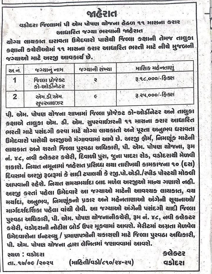 - પી.એમ. પોષણ યોજના ની આ વેકેન્સીમાં આવેદન કરવા માટે તમારે સૌથી પહેલા નીચે આપેલ જાહેરાતનો અભ્યાસ કરવાનો રહેશે અને તમે અરજી કરવાની લાયકાત ધરાવો છો કે નહિ તે ચકાસવાનું રહેશે.